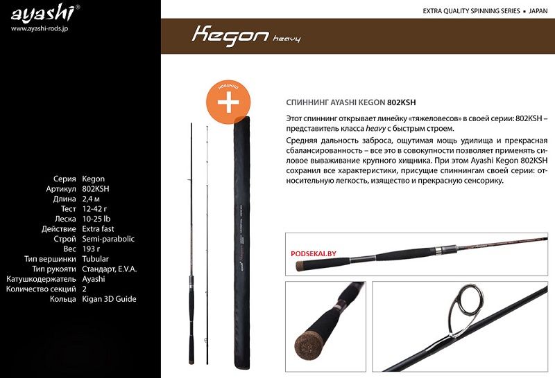 Спиннинг AYASHI Kegon 802KSH 2,4м. 12-42 гр. - этот спиннинг открывает линейку «тяжеловесов» в своей серии: 802KSH – представитель класса heavy с быстрым строем. Средняя дальность заброса, ощутимая мощь удилища и прекрасная сбалансированность – все это в совокупности позволяет применять силовое вываживание крупного хищника. При этом Ayashi Kegon 802KSH сохранил все характеристики, присущие спиннингам своей серии: относительную легкость, изящество и прекрасную сенсорику.