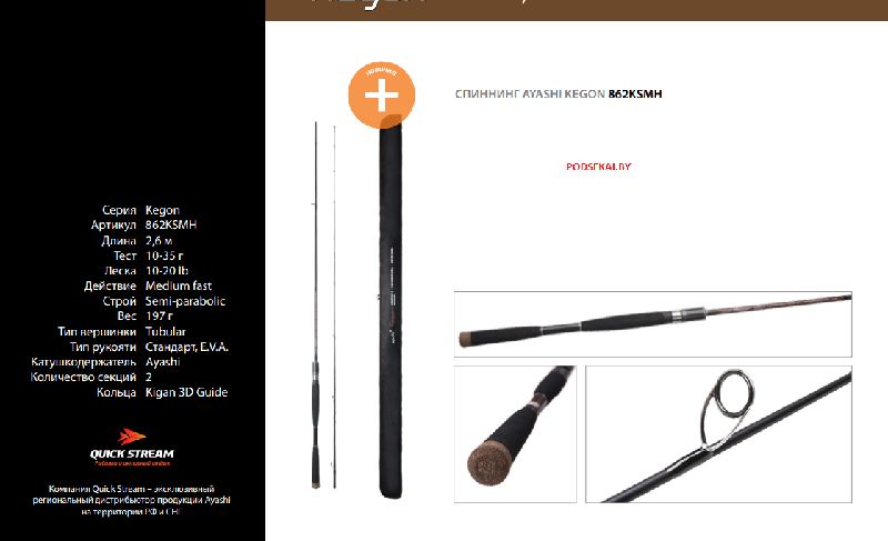 Спиннинг AYASHI Kegon 862KSMH 2,6м. 10-35 гр. - универсальное удилище среднебыстрого строя класса medium heavy. Мощный, надежный, но при этом изящный и достаточно легкий спиннинг. Прекрасно работает по нижнему тесту, несмотря на свой широкий диапазон. Благодаря длине 2,6 м, обладает отличными характеристиками по дальности заброса.