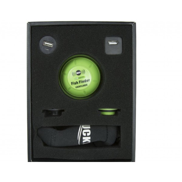 Кроме Wi-Fi extender в комплектации с эхолотом для рыбалки LuckyLaker 916 есть: USB-кабель, с которым вы можете заряжать устройство от сети, от прикуривателя (соответствующие адаптеры есть в комплекте) или даже от ноутбука; 2 запасных крышечки для сонара (зеленая и прозрачная), неопреновый чехол с затяжками и крючком для крепления на поясе, рюкзаке и т.д. Все упаковано в картонную коробку.
