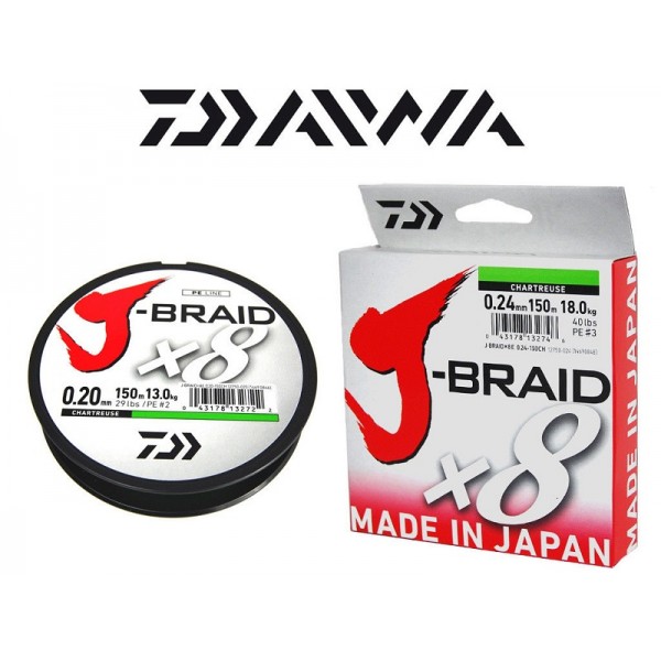 Плетенка DAIWA J-Braid X8 150 м. - высококлассный плетеный шнур отменного японского качества Daiwa J Braid x8 от фирмы Daiwa состоит из восьми волокон высококачественного полиэтилена, имеет очень плотное плетение и сечение, максимально приближенное к круглому. Благодаря этому плетенка обладает поверхностью отменной гладкости. Плетеные шнуры J-Braid X8 имеют практически нулевую растяжимость, что способствует правильной игре приманки и быстрой подсечке, превосходной связи с приманкой, а также более дальнему и точному забросу.