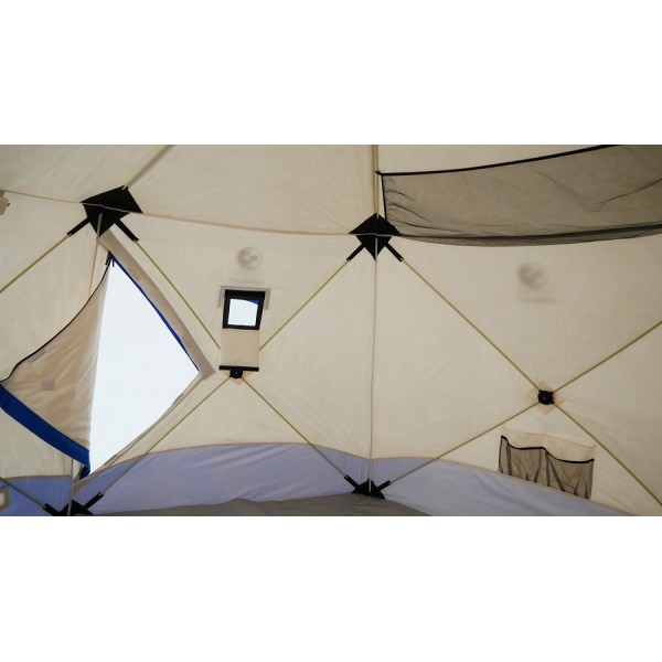 Внутреннее расположение карманов и сеток позволит разместить все необходимые вещи, которые будут всегда под рукой. Наличие 4х окон позволит удобно расположить отопление палатки.