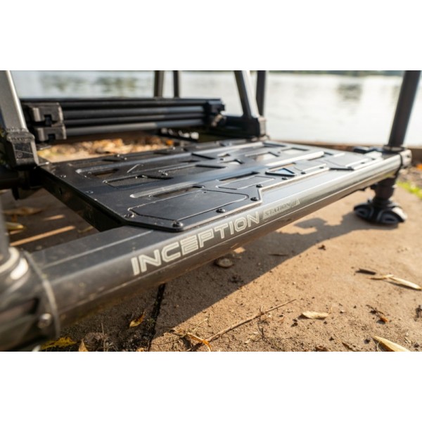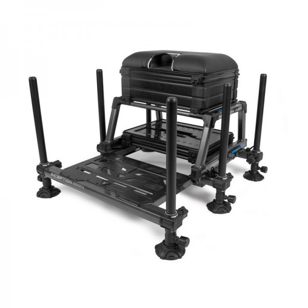 Так же есть пустой неглубокий лоток, расположенный между тягами и сиденьем, который также идеально подходит для хранения оснастки. Модуль под рамой включает 26-мм лоток и крышку, куда при необходимости можно добавить дополнительные блоки. Платформа поставляется с телескопическими ножками x6, позволяющими легко регулировать положение на берегу.