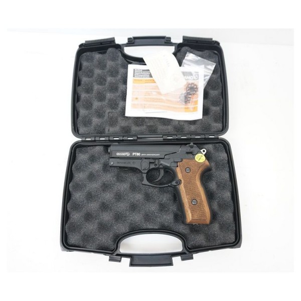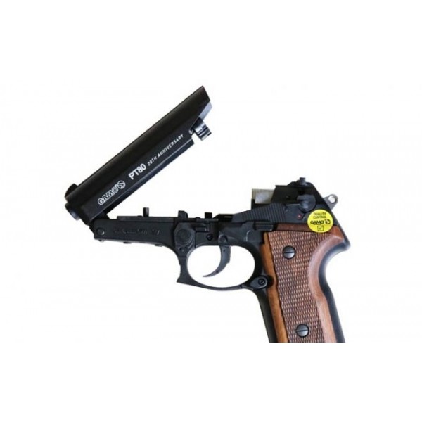 Пневматический пистолет Gamo PT 80 20th Anniversary от стандартной модели отличается деревянными щечками на рукояти. Материал затвора - металл, корпус - пластик. В комплекте с изделием кейс для переноски из пластика. Внутри поролон для исключения механических повреждений пневматики. Вес Gamo PT 80 20th Anniversary не более 500 грамм. Для стрельбы используются целик и мушка, которые не регулируются. Затвор не подвижный при стрельбе, но откидной, прячет клип для снарядов - шариков ВВ или свинцовых пуль. Чтобы открыть затвор необходимо воспользоваться рычажком слева над спусковым крючком.