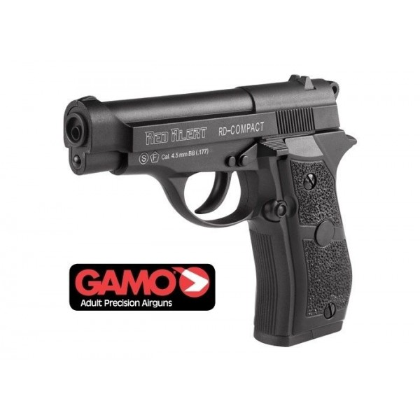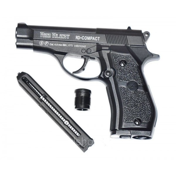 Пневматический пистолет GAMO Red Alert RD-Compact (Beretta) - это пневматическая версия легендарного пистолета Beretta 84, изготовленная известной испанской компанией Gamo уже в Беларуси. Модель отлично подойдет для развлекательной стрельбы, она надежна и привлекательна на вид. Стрельба из пистолета Gamo Red Alert RD-Compact производится исключительно стальными шариками, калибр которых равен 4.5 мм. Хочется отметить, что энергия выстрела модели обеспечивается сжатым углекислым газом, хранящимся в баллончике на 12 грамм, который при нажатии на спусковой крючок вырывается из него. Корпус модели, а так же все основные части её механизмов, изготовлены из металлического сплава, что обеспечивает особенную устойчивость конструкции к различным нагрузкам. Длина пистолета составляет 175 мм, а его масса - 730 грамм.