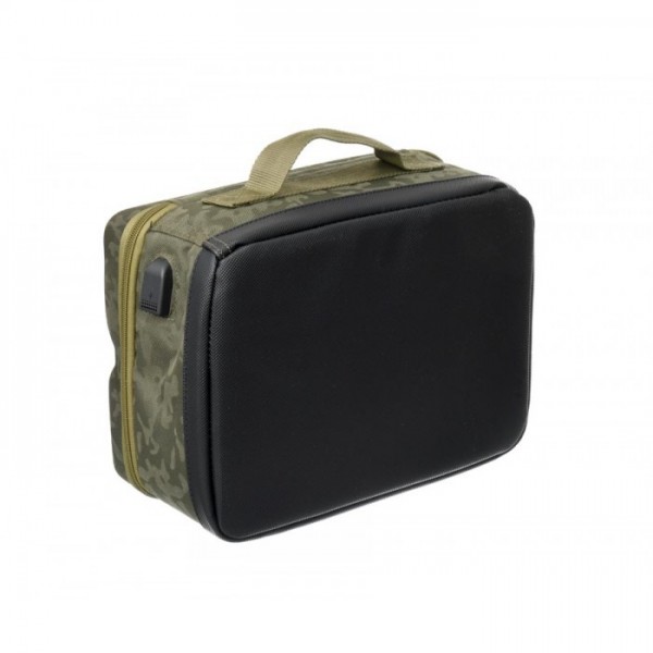 Сумка CARP PRO Diamond для гаджетов - сумка-кейс для карповых аксессуаров и гаджетов. Изготовлена из фирменного влагостойкого камуфлированного материала Oxford 650D. Жесткая крышка может использоваться как столик, который имеет небольшой бортик и на котором удобно заряжать гаджеты. Сбоку кейса выведен наружный разъем USB, подключаемый идущим в комплекте кабелем к Power Bank. Внутренняя часть крышки-столика имеет несколько прошитых матерчатых кармашков на резинке, закрывающихся клапаном, и один большой сетчатый карман на молнии. Внутреннее пространство сумки для гаджетов разделено съемными перегородками на три отделения. Мягкие перегородки с креплениями на липучках надежно защищают содержимое, при этом позволяя с легкостью трансформировать размеры отделений под ваши нужды. Днище кейса оснащено твердой вставкой из ПВХ, защищающей его от проникновения влаги. Для удобства транспортировки предусмотрена ручка.