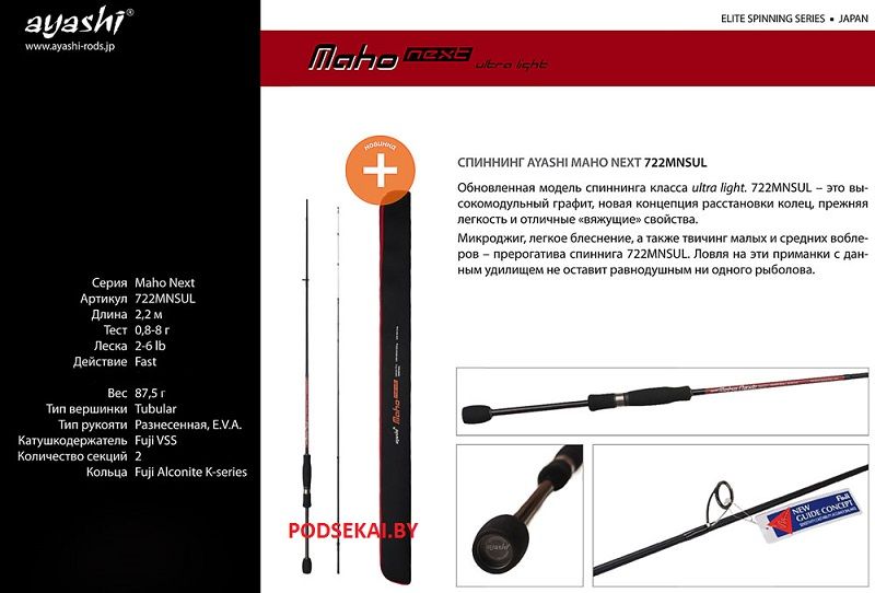 Спиннинг AYASHI Maho Next 722MNSUL 2,2м. 0,8-8 гр. - обновленная модель спиннинга класса ultra light. 722MNSUL - это высокомодульный графит, новая концепция расстановки колец, прежняя легкость и отличные "вяжущие" свойства. Микроджиг, легкое блеснение, а также твичинг малых и средних воблеров - прерогатива спиннига 722MNSUL. Ловля на эти приманки с данным удилищем не оставит равнодушным ни одного рыболова.