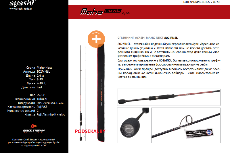 Спиннинг AYASHI Maho Next 802MNSL 2,4м. 3-15 гр. - отличный и надежный универсал класса light. Идеальное сочетание длины удилища и теста позволят вам не просто достать острожного хищника, но и не оставить шансов на сход даже самым изворотливым трофейным экземплярам. Благодаря использованию в 802MNSL более высокомодульного графита, вы сможете применить форсированное вываживание рыбы. Приманки, как и прежде, доступны в полном ассортименте: джиг, блесны, поводковые оснастки и конечно воблеры - изменилось только качество ловли на них.