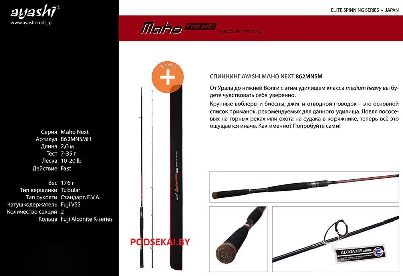 Спиннинг AYASHI Maho Next 862МNSMH 2,6м. 7-35 гр. - от Урала до нижней Волги с этим удилищем класса medium heavy вы будете чувствовать себя уверенно. Крупные воблеры и блесны, джиг и отводной поводок – это основной список приманок, рекомендуемых для данного удилища. Ловля лососевых на горных реках или охота на судака в коряжнике – теперь всё это ощущается иначе. Как именно? Попробуйте сами!