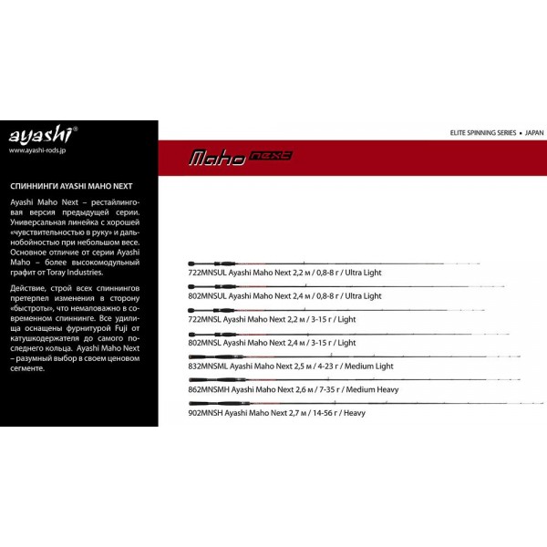 Характеристики спиннинга Ayashi Maho Next 902МNSH 2,7м. 14-56 гр.: