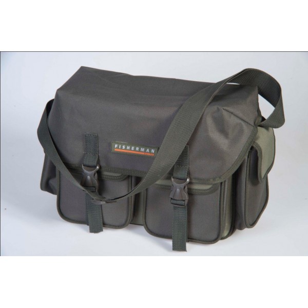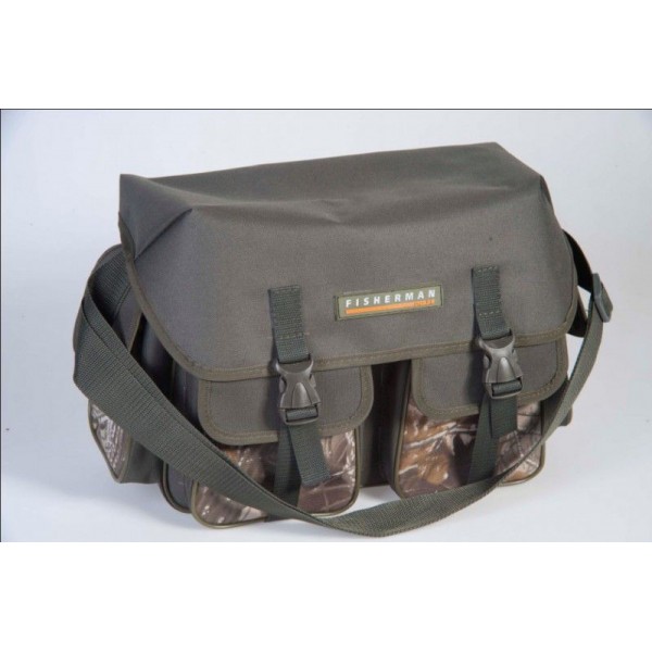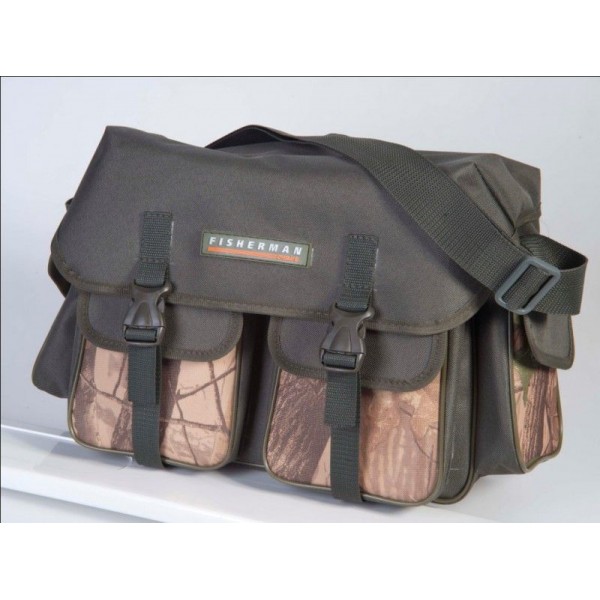 - удобная модель рыболовной сумки с четырьмя внешними карманами. Большой клапан надежно закрывает сумку.