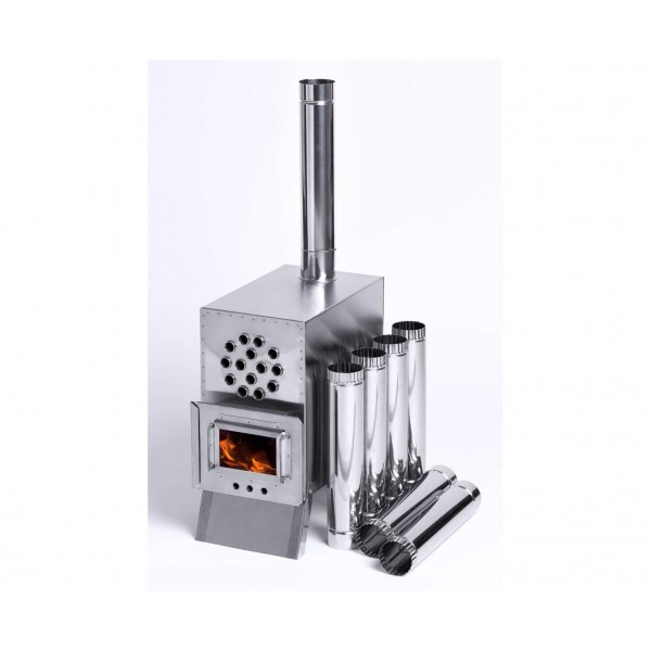 Данная конструкция теплообменника имеет компактные размеры, позволяет разогреть и приготовить пищу, в несколько раз экономить топливо и значительно увеличивает эффективность обогрева, по сравнению с обычной походной печкой.