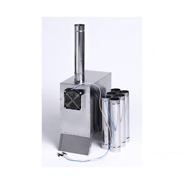 Теплообменник «Вектор-ВД» состоит из металлического короба с проходящими сквозь него трубками и оснащенным выходом под дымоходную трубу, складных ножек и быстросъёмного вентилятора.