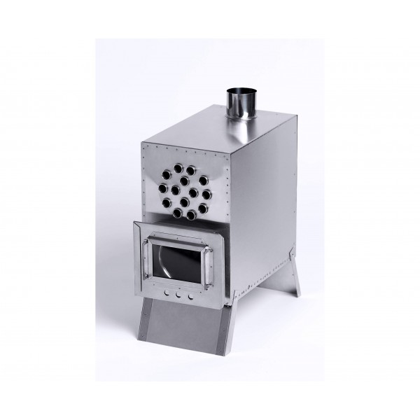 Теплообменник дровяной для палатки ВЕКТОР-ВД - теплообменник предназначен для обогрева помещений (зимних палаток) с использованием твердого топлива (дрова, хворост и т.п.) Обогрев происходит за счет естественной и принудительной циркуляции воздуха. Принудительная циркуляция осуществляется с помощью вентилятора напряжением 12 В, установленного в задней части устройства. При эксплуатации теплообменника, дым и угарный газ отводятся через дымоходную трубу.