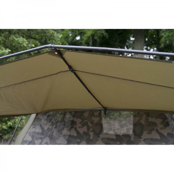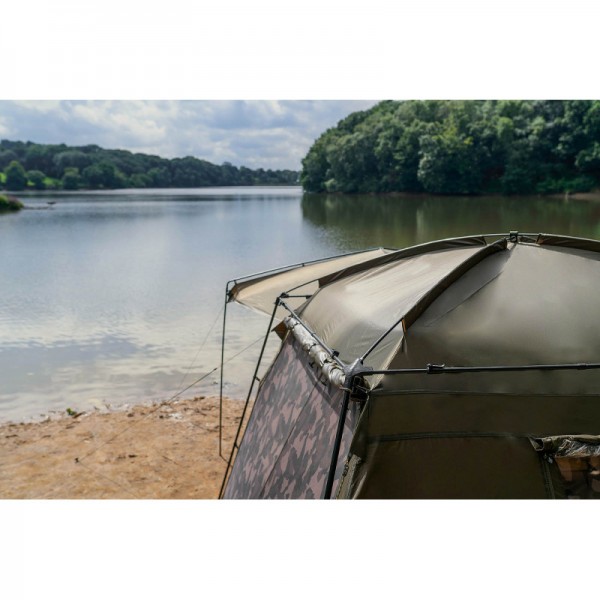 Палатка оснащена большим внешним усиленным тентом, под которым можно удобно расположиться, например, для наблюдения за водой. В задней части палатки имеется довольно большое окно, которое можно закрыть полностью, использовать прозрачный ПВХ-материал или использовать москитную сетку. Палатка построена на тканевой основе с водяным столбом 10 000 мм, сетчатые панели отделаны уникальным камуфляжным рисунком. Все швы палатки дополнительно проклеены.