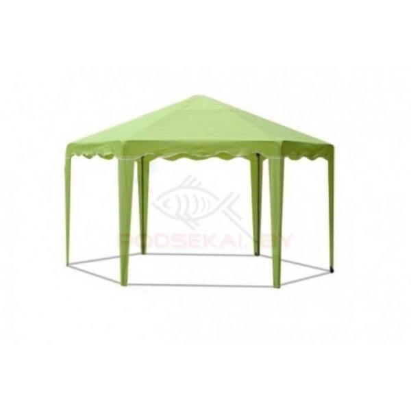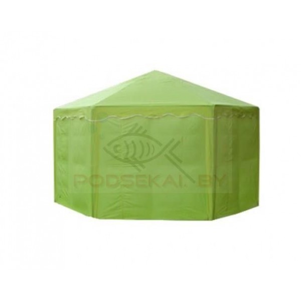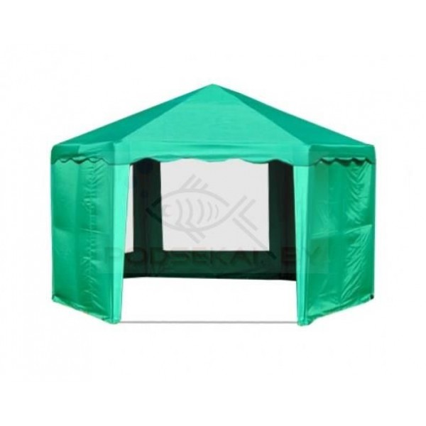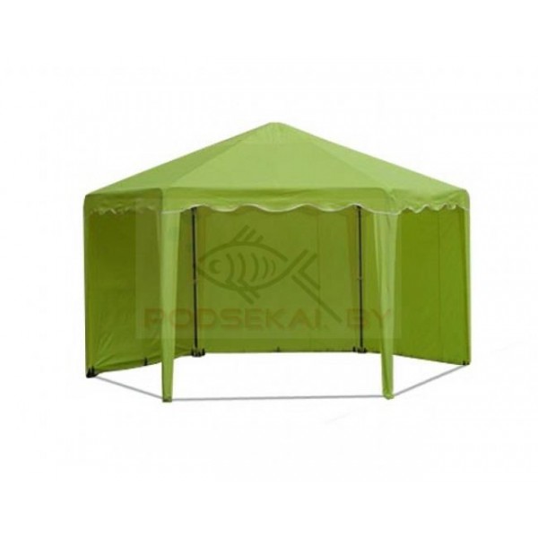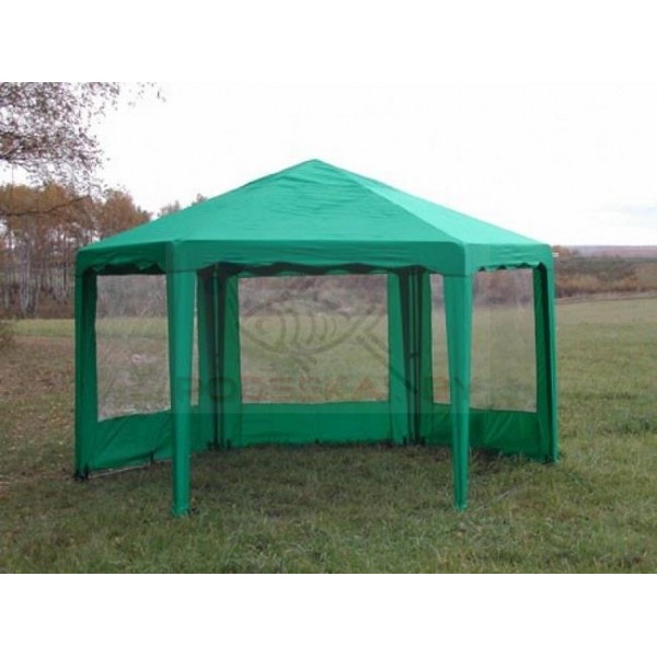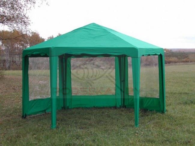 Шатер-беседка МИТЕК 6 граней - оригинальный шатер с шестискатной крышей можно использовать как летнее кафе, дачную беседку или павильон для торговли. Стальной каркас шатра имеет нижнее основание, все его части надежно крепятся между собой. Крестовины сделаны из утолщенной трубы, что позволяет повысить устойчивость конструкции.Стропы и липучки помогают хорошо натянуть тент, что позволяет сделать его частично или полностью закрытым.