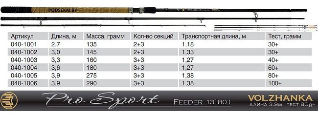 Модели Volzhanka Pro Sport длиной 3.3 м с тестом 40 г+ и 3.6м с тестом 60 г+ (указан максимальный вес пустой кормушки объемом 30 мл), позволяют комфортно работать со средними кормушками на дистанции до 60 метров.