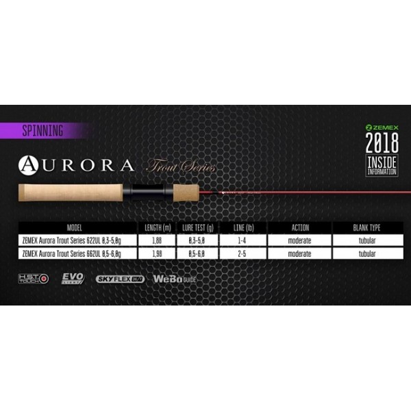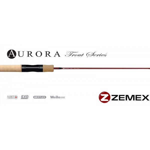Спиннинг ZEMEX Aurora Trout 622UL 1.88м. 0.3-5 гр. - основным предназначением спиннингов серии Aurora Trout является ловля прудовой и речной форели. Серия Aurora Trout состоит из двух моделей, тест и длина которых позволяет успешно оперировать колеблющимися и вращающимися блеснами, мелкими воблерами и сверхлёгкими силиконовыми приманками. Бланки удилищ ZEMEX Aurora Trout имеют средний строй, обладают приличными динамическими свойствами и хорошими кастинговыми характеристиками. Подобный набор качеств делает серию ZEMEX Aurora Trout хорошим инструментом для охоты за голавлём на малых реках. Благодаря своей невысокой стоимости, спиннинги этой модели являются отличным выбором для рыболовов, начинающих постигать всю прелесть увлекательной ловли форели.