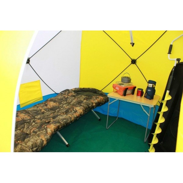 Палатка зимняя СТЭК КУБ 4T трехслойная дышащая - это 4-х местная трехслойная, предназначена для зимнего подледного лова. Каркас изготовлена из cтеклопластика с добавление карбона. Тент изготовлен из синтетической непродуваемой ткани (оксфорд 300PU) . Нижний тент стеганое полотно из синдепона и подкладочной ткани таффета (термостeжка).