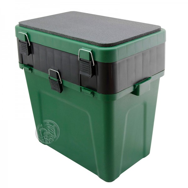 Материал - морозоустойчивый, ударопрочный пластик, который не впитывает и не пропускает воду. Пластик не подвержен деформациям и прекрасно удерживает первоначальную форму ящика даже при значительном весе рыбака. Максимальная нагрузка на ящик – 130 кг. Ящик из такого пластика не впитывает запахи и легко отмоется от рыбной слизи, глины и других загрязнений.