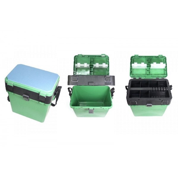 Ящик зимний зеленый ТРИ КИТА (380*360*240) - в крышке ящика предусмотрены четыре отделения для хранения насадки и мелких принадлежностей. Каждое отделение закрывается крышкой с пружинными фиксаторами, выполненными из прозрачного полипропилена. Среднее отделение ящика также имеет четыре отделения для хранения насадки и мелких принадлежностей. Нижняя емкость может использоваться для хранения прикормки, крупных рыболовных принадлежностей или улова. Морозостойкость: до -40С
